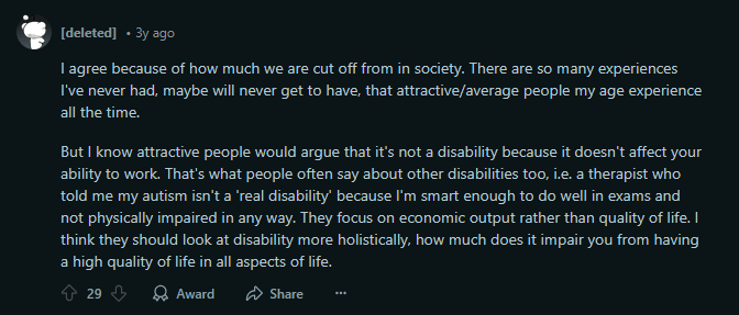 Looksmaxxing might translate effectually as this countervailing tendency against un-health and unattractiveness, as an exercise of morally correct will and active self-improvement like good and happy late liberal subjects should. Nonetheless as the opening visual shows (however unconvincingly), this interpretation might be misguided in its focus; a sharper critique of this exercise can be articulated in the public discussion of looksmaxxing and its various trends that turn attractiveness into a health-pedagogy, a value-creating project that may or may not administer effective treatments to ill will and unattractive life. The post below speaks to this treatment as an attempt to explain unattractiveness as disability (Figure 5).