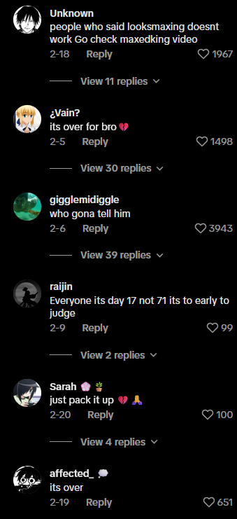 https://www.theguardian.com/lifeandstyle/2024/feb/15/from-bone-smashing-to-chin-extensions-how-looksmaxxing-is-reshaping-young-mens-faces; https://www.bbc.com/culture/article/20240326-inside-looksmaxxing-the-extreme-cosmetic-social-media-trend; https://www.nytimes.com/2023/11/06/style/looksmaxxing-tik-tok-dillon-latham.html; https://theconversation.com/looksmaxxing-is-the-disturbing-tiktok-trend-turning-young-men-into-incels-221724; https://www.menshealth.com/grooming/a63149374/looksmaxxing-auramaxxing-scentmaxxing-trend/ ↩︎