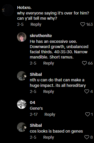 https://www.tiktok.com/@iam.willcar7/video/7467562103633644806?_r=1&_t=ZS-8usvNNDdiQK. As demonstration of the specificity of the medicalized language: “downward growth” refers to the downward shifting of the lower part of an individual’s face that leads to less defined jawlines and a flatter sidewards facial appearance; excessive “upper eyelid exposure” refers to the thickness of the individual’s upper eyelid, where thinner upper eyelids are preferred to give the eyes a sharper, more “predator” like look; “unbalanced facial thirds” refers to the distribution of particular facial sections (nasal, forehead, lips); “40:35:30” may refer to the unbalanced facial ratios of these different sections of the individual; “Narrow mandible” refers to a smaller lower jaw, leading to a smaller chin and less vivid jawlines; “Short ramus” refers to the section of the lower jaw that determines the side length of the jawline. ↩︎