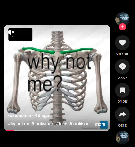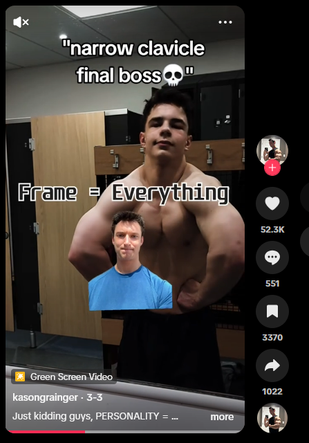This sort of shot-calling – or shutting down – of the project typically projects a fatal certainty in biological immutability and genetic “destinies” through specific medicalized terminologies. One example is the clavicle, a shoulder bone that determines the width of one’s shoulders and upper body, where a shorter one is less preferred. Clavicular size in this instance is seen as immutably true, determining the actual attractiveness of anyone’s attempt to looksmax.