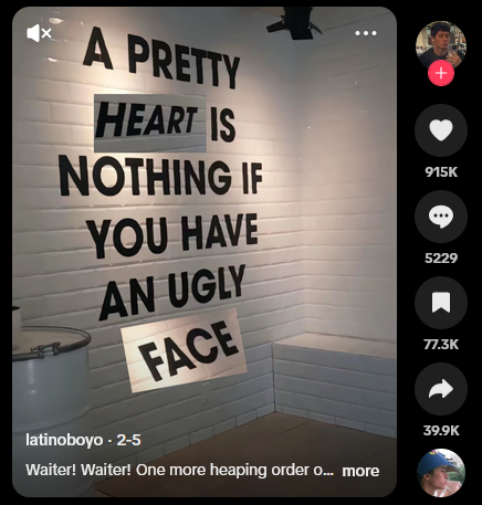 It is insufficient to say that these people have an illness of desire that requires an exhortation of such to move towards a more politically labile fantasy, just as it is insufficient to model other kinds of embodiment (“dark is beautiful”) that may or may not look concrete and tenable as alternatives to inhabit. Be it with short men or dark women, the work within unattractive life embroils one in stringent discourses of sovereign control and choice that provide no exit from one’s own embodiment and physicality (Figure 13). Looksmaxxing offers this psychosocial defeat in beginning the process of hammering, mewing, and sculpting your body toward this model of (white) attractiveness, eschewing the more impossible work of examining our desires, where they come from, and how to really “change” them, if even. It marks an initial departure from sovereignty whilst remaining in a phantasm of it, as the impossible, incredulous methods of looksmaxxing look increasingly like dissociative, laborious acts that try to shed the weight of being in life, unattractive life.