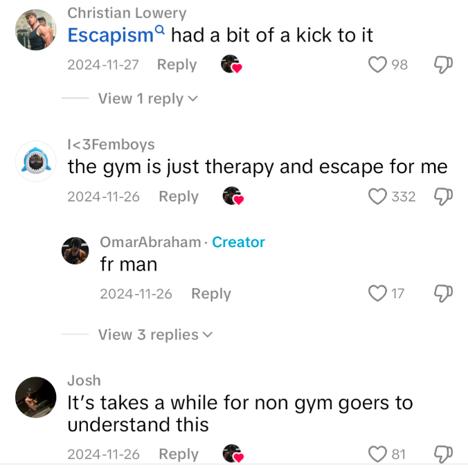 This chapter opens with visually striking proposition: that the achievement of masculine muscularity is neither motivated by promises of larger sexual apportionment (to “get more huzz”17) nor on the possibility of homosocial bonding (“to be with the bros”), but on a predominant and overwhelming sense of crisis ordinariness,18 one that is intensely personal and intimate at the same time that is it deeply impersonal and collectively shared. The TikTok in Figure 1 continues with two other complementary misconnections (Figure 3) – of escapism and mental baggage – that allegedly defines the muscularity of the fantasized image we typically see. I start with this TikTok because it offers this disconnect between the visibly spectacular and the implicit intractability of being spectacle; or in other words, it speaks besides the larger conversation of obsessive self-work in hopes of a good sexual/romantic life to propose that, perhaps, or after all, this obsession is borne from a position of impasse in a generalized every day. Such labor may permit the creation of erotic capital19 that leverages sexual desirability for (bio)power, but what interests me in these images is the inversion of that logic on its head – that the sight of a well-built body is, in fact, obscurantist politics for deeper misgivings, dissociative gestures, or just plain old trauma.20